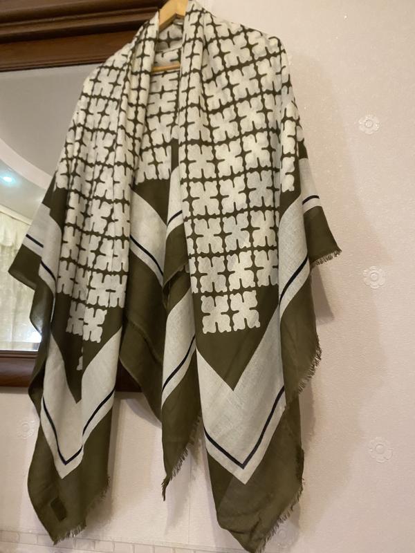 Хустка виготовлена брендом ВУ MALENE BIRGER. Malene Birger — це данський модний дизайнер, відома своїм жіночним та богемним стилем. • Дизайн/Візерунок: Візерунок, який покриває більшу частину хустки, є варіацією традиційного близькосхідного візерунка, відомого як арабеска або мотив "арафатки" (шемаг/куфії). у цьому випадку він має темно-зелений (хакі) та кремово-білий кольори. Цей візерунок дуже популярний у моді як символ стилю. • Тип виробу: це великий аксесуар, який можна носити на ший, плечах або як головний убір. Етикетка зі складом відсутня, але ця модель хустки досить відома і виготовлена із тонкої високоякісної вовни. Саме через те, що вовна досить тонка і має досить рихлу структуру, хустка має затяжки, чи сліди від них в різних місцях хустки. Але вони не впадають в око. ( останні три фото) Хустка має надзвичайно великий розмір : 140 см на 140 см Рекомендую замовляти безпечну оплату, щоб все роздивитися
