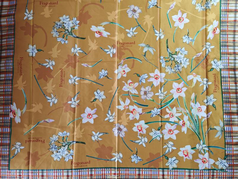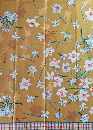 Весняна хустка “Фрагонар” - 68×68 см Этот платок - как первое дыхание весны. На горчично-желтом фоне расцветали нежные нарциссы: белые лепестки с солнечно-оранжевыми серединками, тонкие зеленые стебли, тянущиеся к свету. Между цветами порхают маленькие белые птички - как будто весна сама прилетела, легкая и бодрящая. По краям - яркий пледовый бордюр в красно-зеленой гамме, как теплое воспоминание о уже относившемся зиме. А красные буквы Fragonard Parfumeur напоминают: красота имеет аромат, и он - весенний. Ця хустка - не просто аксесуар. Это прогулка по цветущему саду, где каждый цветок -обещенная теплая, каждая птица - песня обновления. По заказу пишите в ТГ **********