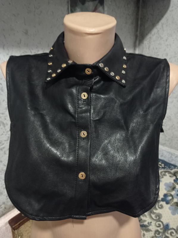 Воротник под кожу, застегается на пуговицы.По бокам регулируется,сверху воротник декорирован заклёпками. Стильно будет смотреться по верх платья, рубашки или гольфа. Бирки с составом нет. Состояние идеальное. Размер указан S/M. Замеры:ширина-28,5 см;плечи-34 см; длина-31,5 см. Фото на теле нет. Пересылка.
