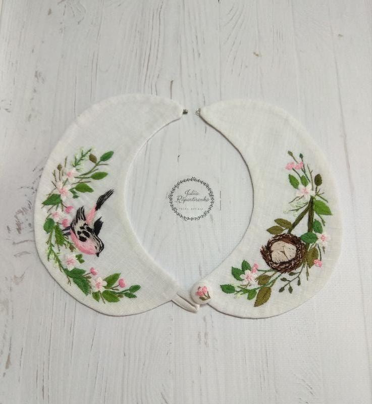 Цей комір створений південна красуні для завершення її неймовірного луку з светром оверсайз в пухкенькі коси. Форму комірця, як і розмір можна підібрати індивідуально. Комір може бути виконаний з таких матеріалів: Муліне DMC та Madeira або справжній шовк для вишивки; Бавовна сорочкова або льон(верх); Змішана тканина для підкладки (70/30 бавовна/поліестер, для кращого догляду і витривалості); Можна підшити на внутрішню сторону квітасту або гладкофарбовану бавовну Флезилін тоненький; В свої роботі я завжди пришиваю гарний настрій, фантастичний цибулю, творчі прогресивні ідеї,якими ви вражатимете своїх колег). Догляд: Ручне прання ручками! з рідким пральним засобом за температури 30°. Після прання рівненько скласти та притиснути, щоб скла вода. Прасувати через білу тканину, праскою придавлюючи вишивку. Товар виготовляється на замовлення
