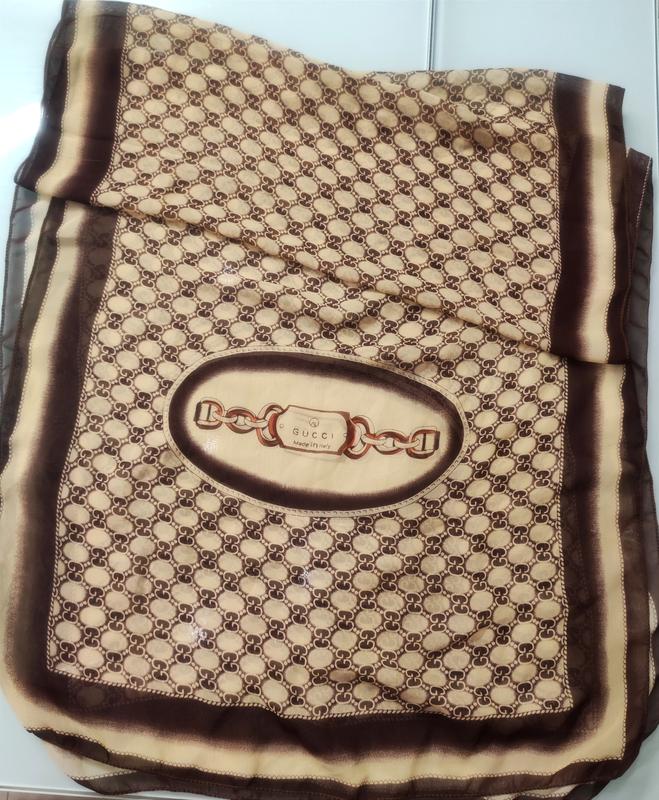 Шаль чудової якості від Gucci. Приємний на дотик, дуже гарно виглядає. Стан ідеальний,є невеликий ньюанс (останнє фото). Розмір 156см. × 50см.