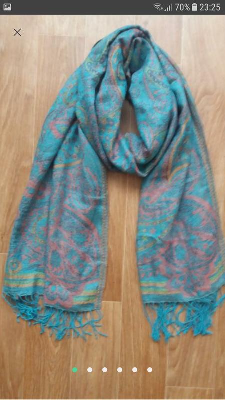 Шаль сине бирюзового цвета с принтом по всей поверхности розово-бежевого.Состав и бренд указан.Стан отличный.Размер: 200×68см.