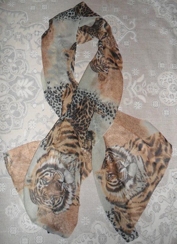 Шаль женская тонкая полиэстерная с изображением тигров с леопардами, размер ~44х156 см, изготовлено в Италии для британского бренда Tie Rack без признаков ношения