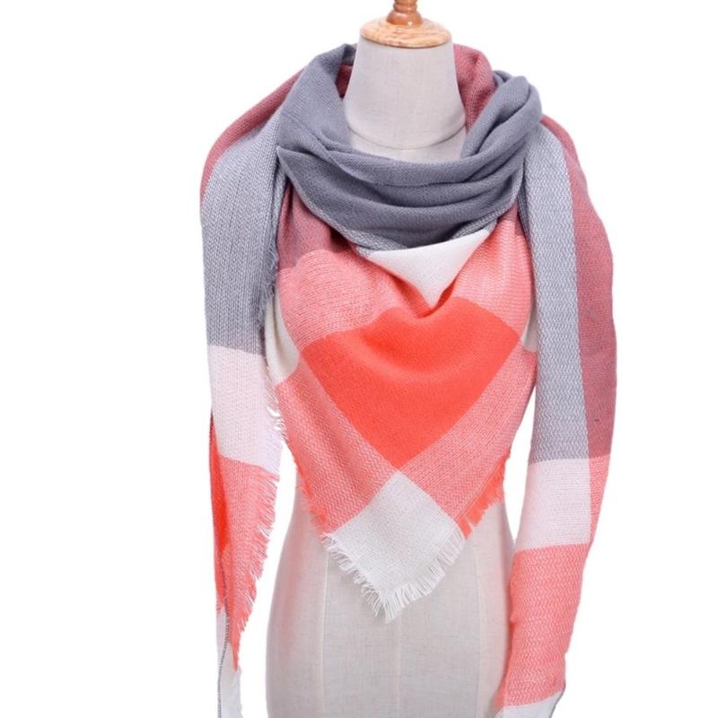 Жіночий трикутний хустку на плечі в клітинку сіро-лососеви.