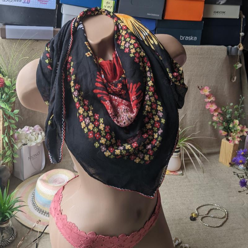 есть некоторые нюансы несколько зацепок. микроскопические катышки на расцветка очень красивая хочется ещё поносить положение как на фото сложенное треугольником высота треугольника 70 диагональ 155