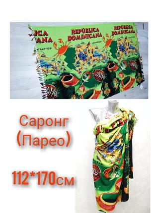 Пляжный наряд саронг или парео. Края обрамлены кисточками. Невероятно красивый и интересный для изучения принт!) Прилагается бирка - инструкция с схемами завязывания. Благодаря размеру, позволяет носить различными способами ( можно посмотреть в интернете) Размер 112*170 см. Новое.