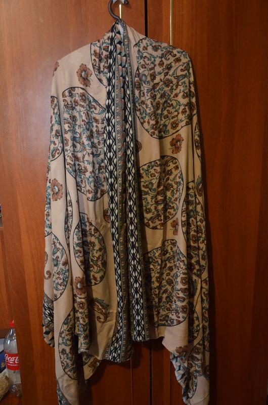 Палантин-шарф на межсезонье, но можно и теплой зимы. В жизни расцветка ярче, чем на фото. Основной цвет бежевый, кофе с молоком. Размер длина 2 метра, ширина 1 метр 15 см. Рисунок односторонний (фото 10) Ткань достаточно плотная, по ощущениям добавлена натуральная нить,ткань хорошо спадает и струится поэтому можно носить палантин различными способами. Доставка Новая почта и Укрпочта.