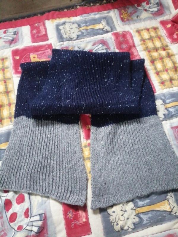 Сине-серый вязаный шарф, вязкая машинная. Тепленький. Размер: 200*23.5 см. Новый, привезенный из Германии, но бирка срезана.