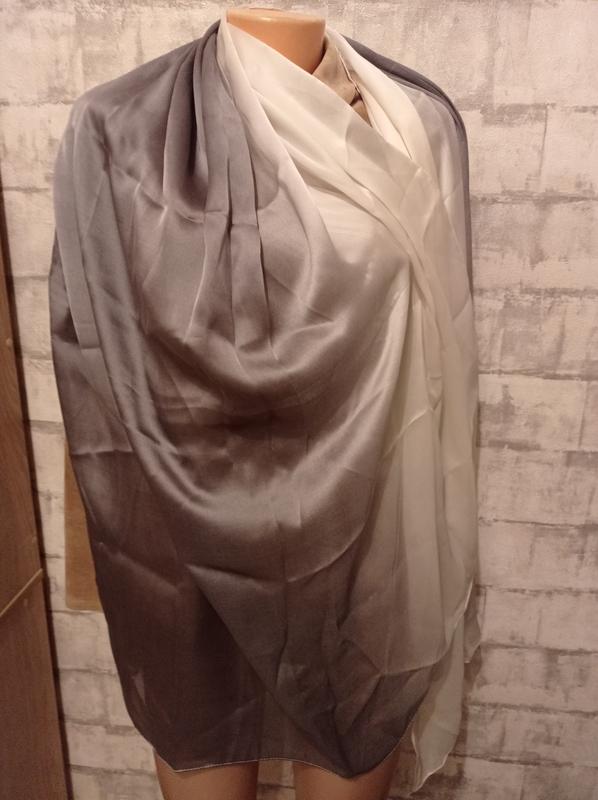 Градиент от белого к графитовому . 100% шелк. Размер длина 180см ширина 90см. Состояние новой вещи, зацепок, пятен, дефектов нет.