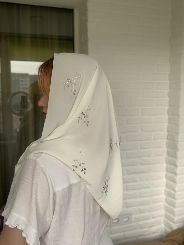 Платок 120/120 см сшит в треугольник Склад : креп/шифон Украшена камушками Молочного цвета Не сползает с волос Идеальный вариант для венчания, крещения, свадьбы, или просто для храму