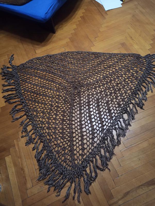 Вязаные крючком платки, одна большая в коричневых оттенках, размер 1,36*1,20 м плюс френзли 18 см. Вторая узкая, черного цвета, ширина 1,93*0,36 м плюс френзли 23 см. Еще черный махровый шалик, размер 1,7*0,20 м плюс френзли 22 см. Цена за единицу 250 грн.