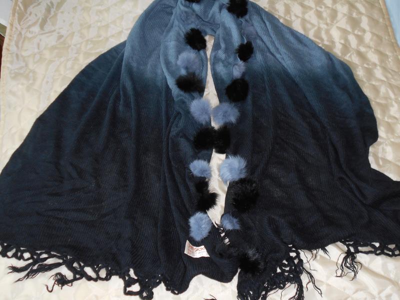 Шарф палантин с бубонами из натурального меха. 70% пашмина 30% полиэстер, размер 164*68 без бахромы.
