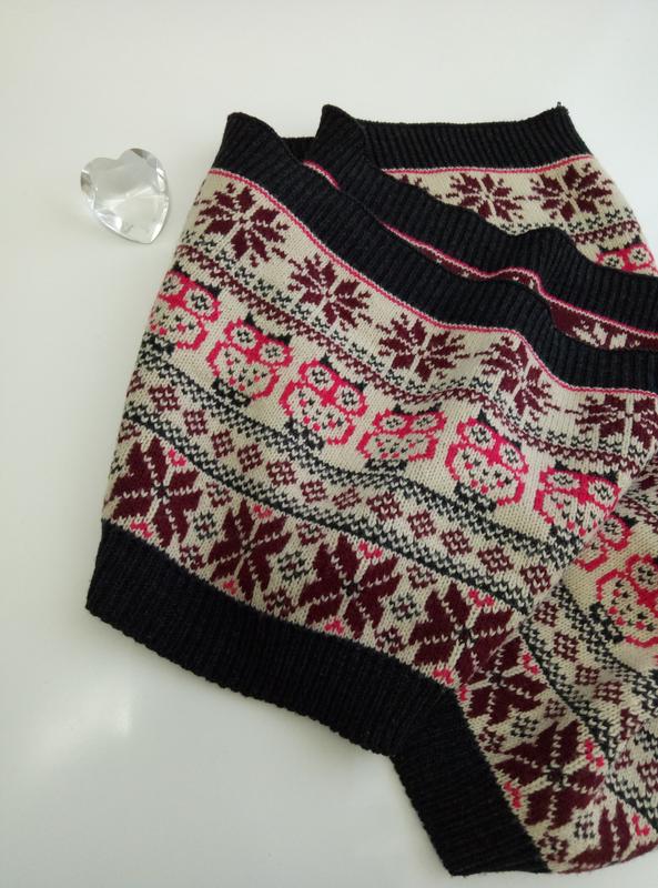 Теплый зимний вязаный шарф хомут в принт совы. Ширина шарфа - 26 см, Полуобхват по длине (т. к. сшит хомутом) - 86 см (соответственно полная длина 172 см)
