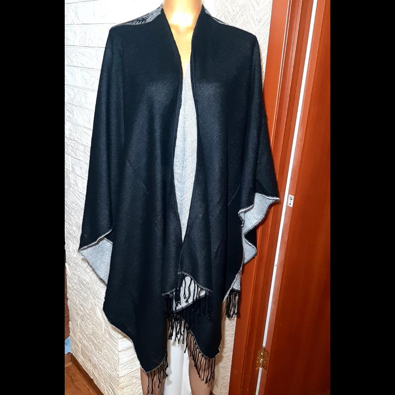 пончо pieece.двух стороннее.,одна сторона черная дрцгая светлосерая. ЕСТЬ НЮАНС.ЗАТЯЖКА НА ЧЕРНОЙ СТОРОНЕ.НА СЕРОЙ БЕЗ НЮАНСОВ.НУЖНО ЗАТЯНУТЬ НИТКУ. УМЕЛые ручки решат эту проблему.Указал на последнем фото.
