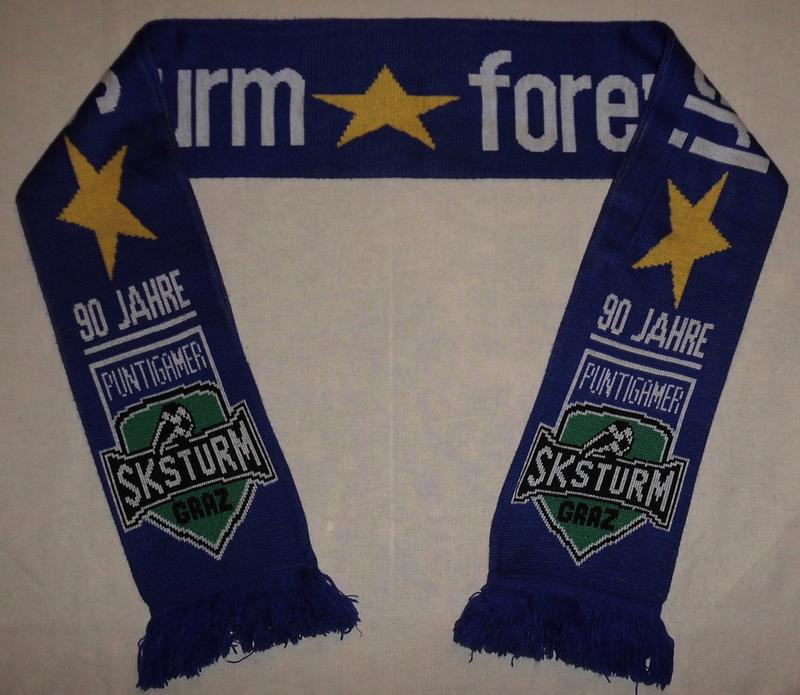 Двусторонний фанатский шарф австрийского футбольного клуба «Штурм» (Sportklub Puntigamer Sturm Graz), включает в себя три звездочки и надпись "Sturm forever!", также 90 Jahre (юбилейный - 90 лет). Стан идеален.