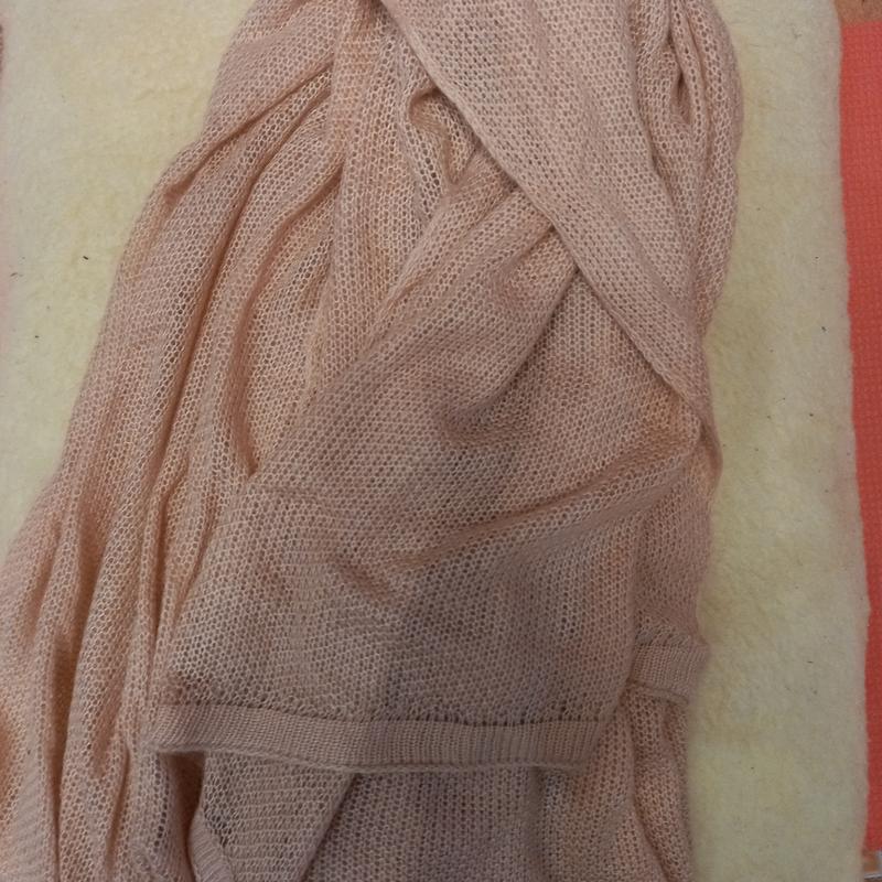 Шарф палантин пудрового цвета,новой, тоненький ажурной вязки.Размеры: 230×90