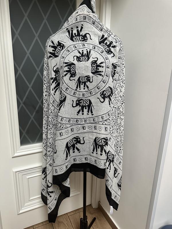 На картинке представлен легкий текстильный шарф или накидка с черно-белым узором. В центре и по периметру изделия повторяются фигуры слонов, выполненных в декоративном стиле, напоминающем индийские мотивы. Между ними расположены орнаменты с геометрическими и абстрактными элементами. Ткань выглядит полупрозрачной, края аккуратно обработаны. Общий стиль изделия подходит для этнического или повседневного образа.