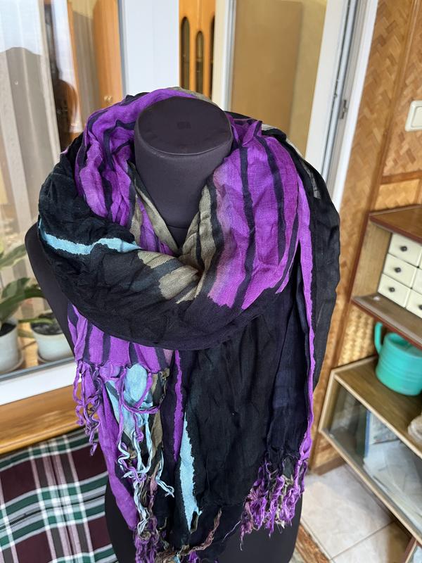 Широкий шарф, красивое сочетание цветов голубого, черного, фиолетового и хаки