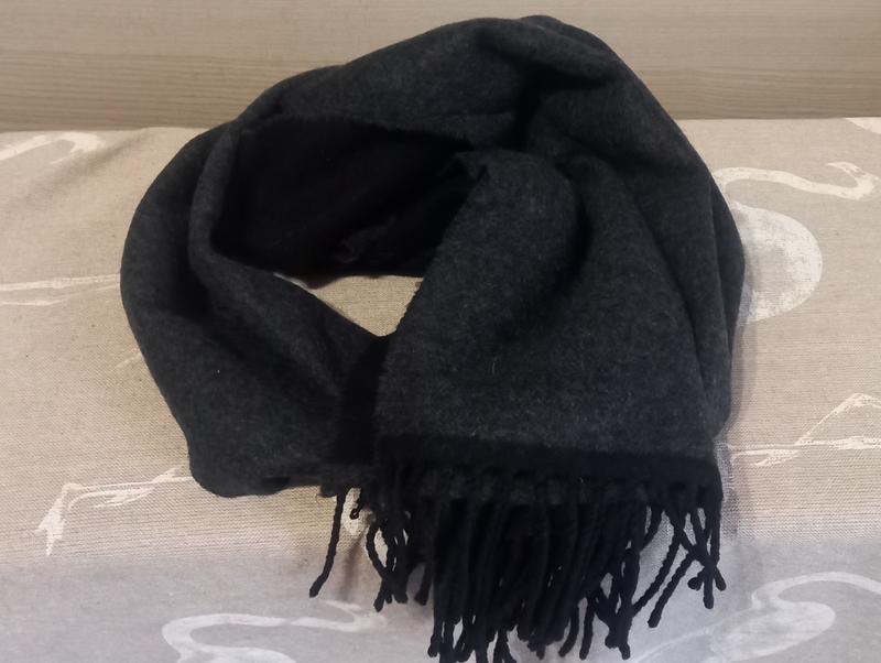 Широкий двухцветный шерстяной (100%) шарф великолепного качества сделанный в Италии Одна сторона - темно - серого цвета, 2-я - черного цвета. Состав - шерсть 100% Размеры: длина - 175 см, ширина - 39 см