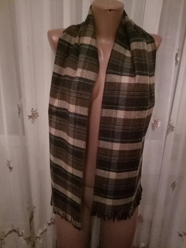 шерстяной шарф в клетку, тонкий, в черно-коричнево-бежевых тонах, средней длины, по краям бахрома, подойдет и мужчинам