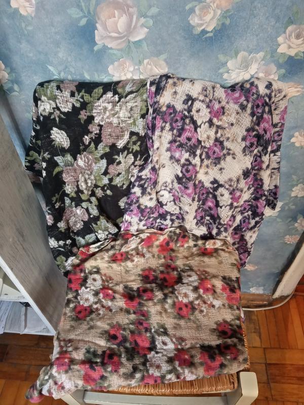 набор - 3 шарфа в невероятный цветочный принт из мягкой вискозы цена за 3 шарфа вместе модель - снуд длина 80 - двойная ширина 60 совершенно новые без бумажных броков на двух есть зацепки - незаметны при носке доп фото по запросу отправка НП или укр по почте в день оплаты бмина и возврат нетерс просмотры НЕ отправляю с безопасной оплатой не работаю