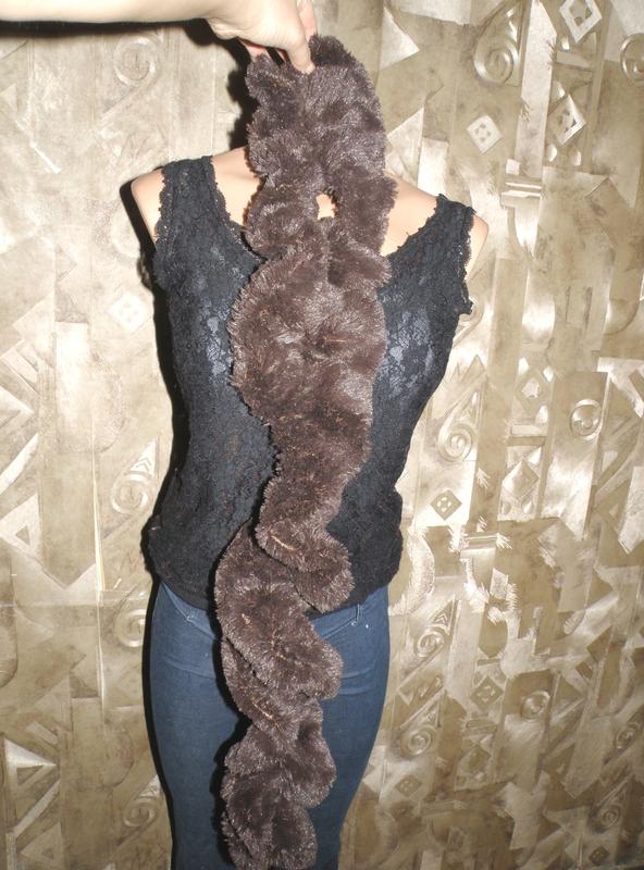 мягенький, теплый, коричневый шарф-резинка чтобы не давило и было комфортно, шарф вокруг шеи можно обернуть-застегнуть как на 2фото 2 раза для этого нужно протянуть 1конец шарфа в дырочку на другом его конце длина без растяжки - 78см длина с растяжкой - 1м 64см
