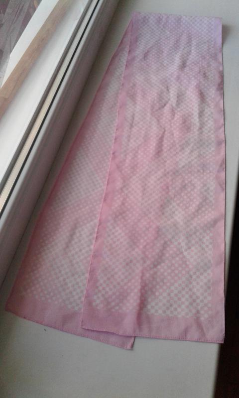 Тоненький , легенький, воздушный, невесомый слегка прозрачный , розовый шарф с чередующимся геометрическим узором в мелкую клетку и горох .Размер 144х20 см .