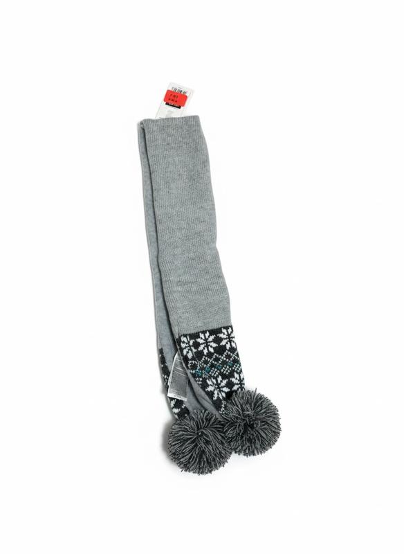 Стильний та зручний шарф у сірому кольорі, оздоблений бубонами. На кінці шарфа — декоративний візерунок, що додає оригінальності. М’який та приємний на дотик, підходить для щоденного носіння в прохолодну погоду. Довжина: 90 см Ширина: 10,5 см
