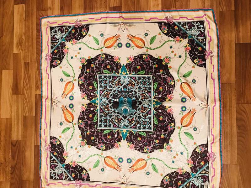 Состояние идеальное,без дефектов.Очень красиво смотрится и приятний на ощуп.Размер 89*89,шов роуль,бирки нет.