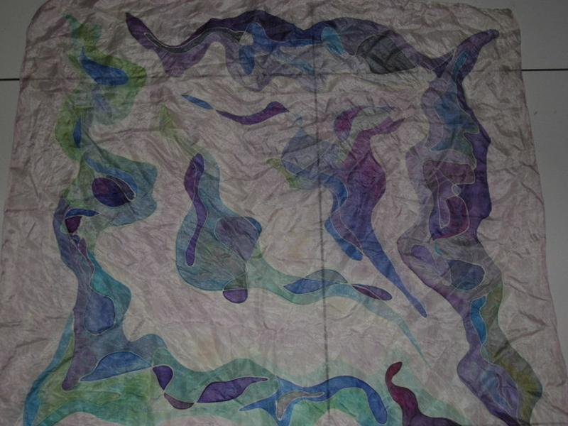 Платок из натурального шелка.Шов роуль. Раскраска платка-ручная. В живую смотрится ну очень красиво-фото не передает его красоты. 86/93 см. Состав: 100% шелк