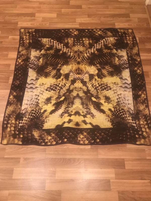 Очень интересный дизайн платка.Красивый принт,цветовая гамма-чёрный,жёлтый,фиолетовый.Из дефектов одна маленькая затяжка,вообще ничего не видно при использовании.Размер 115-115(очень большой)