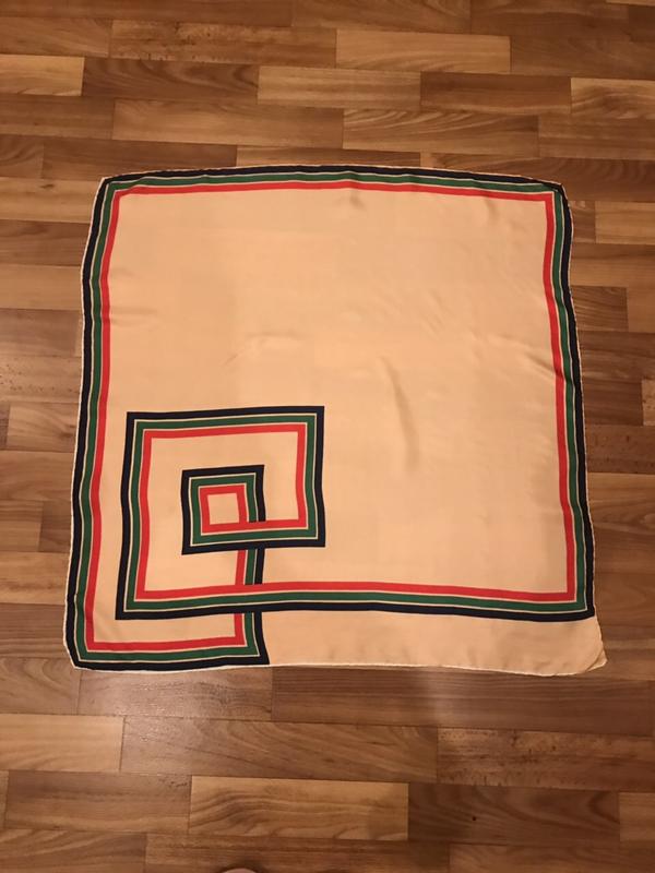 Красивый платок ,интересный дизайн. Основной цвет-персиковый. Есть 2 небольшие точки (на фото) При носке не видно абсолютно,в цене учтено. Шов роуль. Размер 70*70