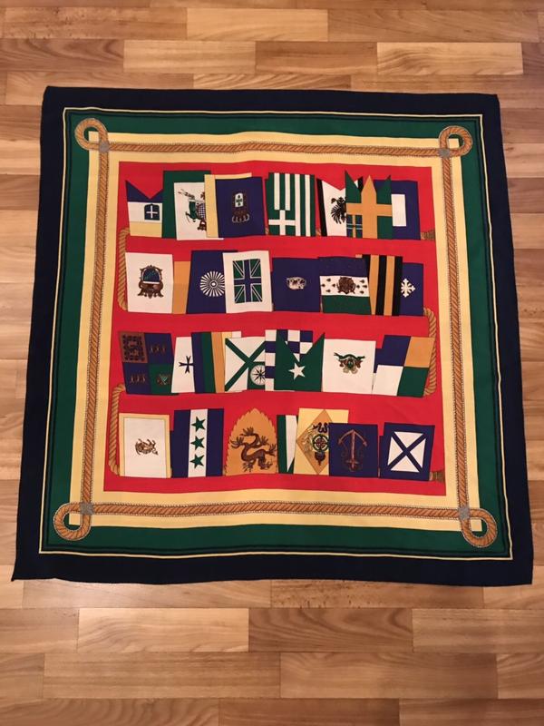 Очень интересный и стильный дизайн платка. Состояние очень хорошее,на одном конце платка ,небольшой дефект (на фото), в носке невидно, в цене учтено. Очень красивый,размер 87*89