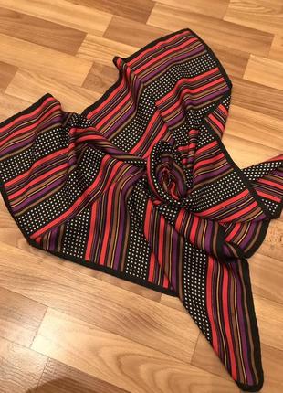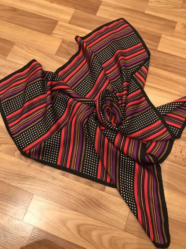 Красивый платок, состояние очень хорошее,есть небольшие белые точки (заводской брак,в реальности меньше) Шов роуль,саржевый шёлк,размер 76*77