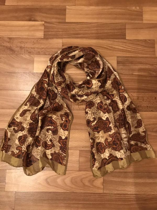 Очень интересный дизайн платка,принт Пейсли. Состояние идеальное,шов роуль,бирка срезана. Размер 34*158 Основной цвет-горчично-золотой. Очень красивый и стильный,очень красиво смотриться на теле.