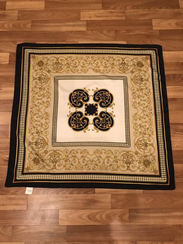 Очень красивый и стильный дизайн платка. Состояние очень хорошее,небольшая зацепка в носке невидно вообще, в цене учтено Размер 77*80 Основной цвет-синий