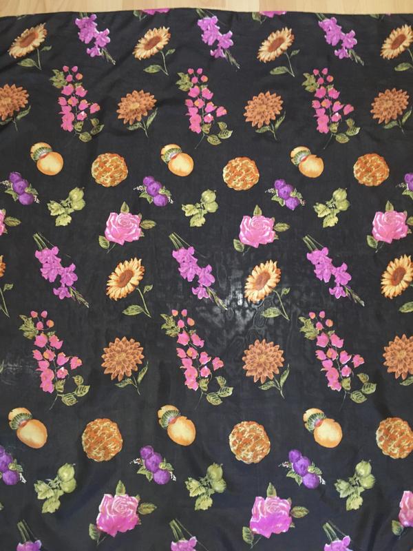 Платок в отличном состоянии,бирка,машинная обработка края,на чёрном фоне цветы и плоды,яркие,нюансов видимых нет