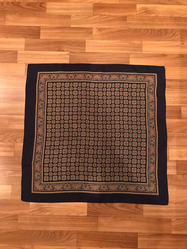 Красивый и стильный дизайн платка. Состояние идеальное, без дефектов. Основной цвет Классический синий. Бирка срезана,материал на ощупь саржевый шёлк. Выглядит дорого,стильно и красиво. Размер 68*69