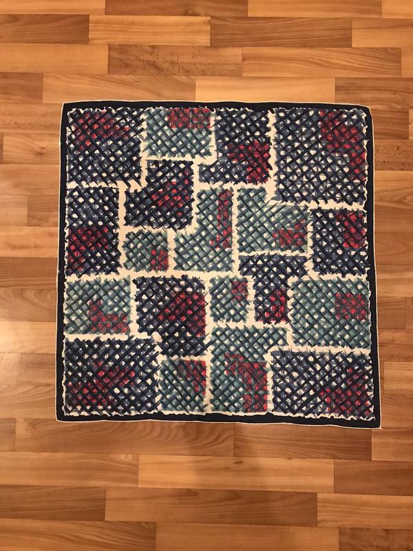 Стильный дизайн платка. Материал саржевый шёлк средней плотности. Бирка срезана,шов роуль. Несколько стетиков на просвете, в носке невидно вообще. Размер 66*68