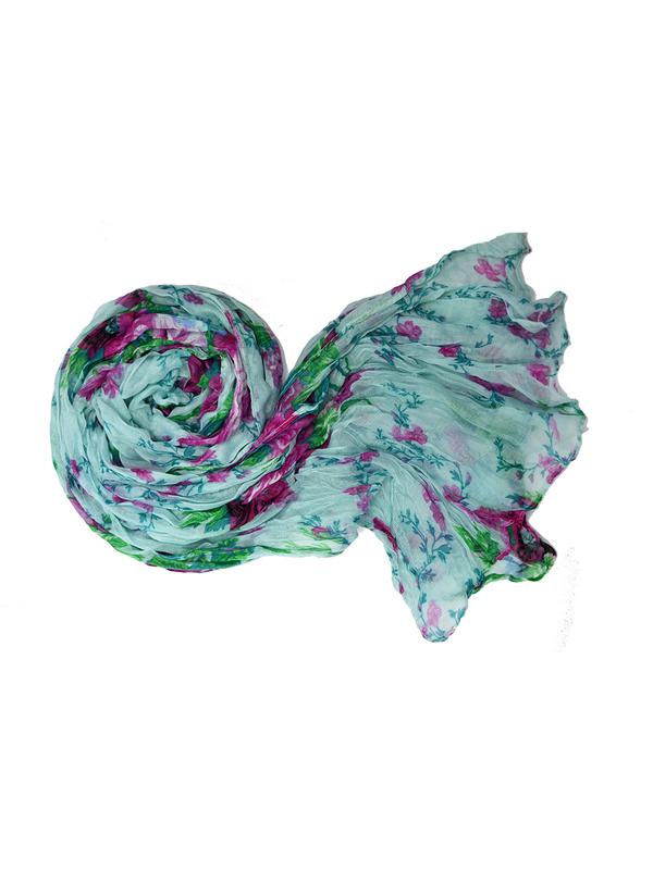 Шарф голубой в цветочный принт, жатка-косичка (вискоза)