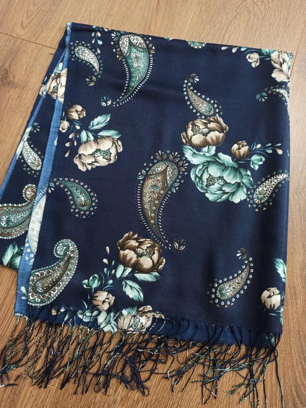 шарф синего цвета,рисунок турецкие огурцы и розы,очень красиво смотритсч