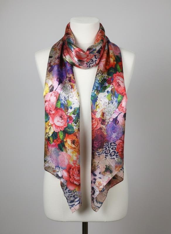 Яркий шарф из 100% атласного шелка, ткань почти не мнётся Двусторонний, с одной стороны атласный, глянцевый яркий в цветах, с другой более тусклый, матовый в леопардовый принт Англия Длина - 168 см Ширина - 70 см