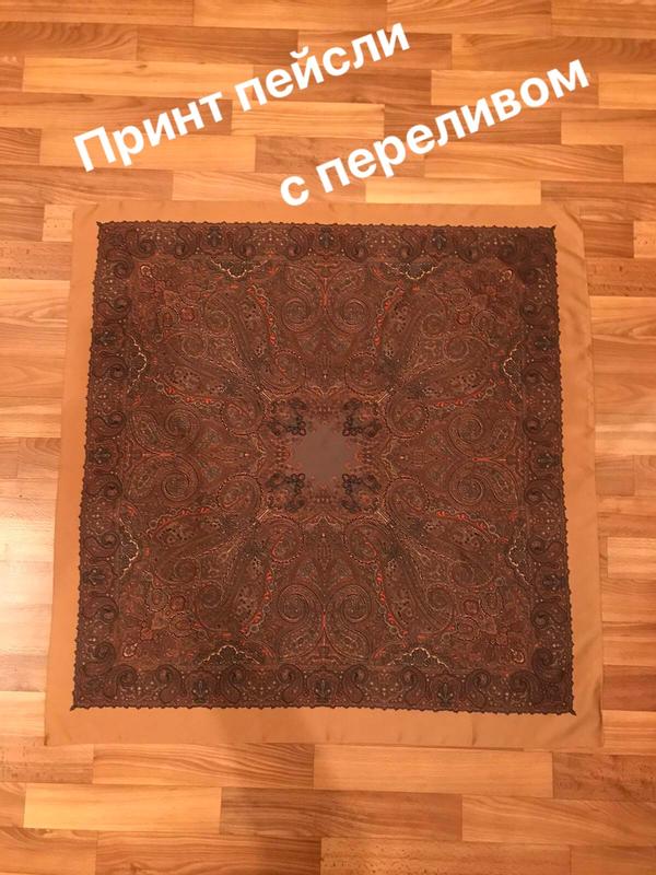Очень красивый в реальности платок,принт пейсли . Материал очень качественный полиэстер с переливом. Бирка есть,состояние идеальное,единственный стетик на просвете,в носке и принте не видно вообще . Размер 88*89 Основной цвет-охра.(беж)