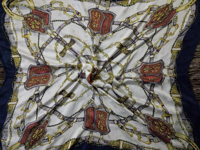 Платок с интересным сюжетом. Размер:80/88см.Состояние без зацепок, шов роуль, бирки с составом нет, но по ощущениям шёлк