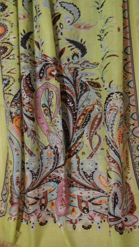 Очень мягенький приятный по цвету и к телу, края салатные рисунок коричнево серый черный и розовый цвета длина 180 см ширина 105 см