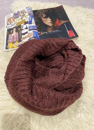 На тілі немає))в'язка заводська,по ній паєтки)щільність середня,тягучий)на моделях для прикладу) Шарф оригінального крою – зв'язаний по колу, актуальне для людей будь-якої статі і віку. Шарф-хомут або снуд володіє великими можливостями у створенні креативного образу в неформальному і діловому стилі. До того ж, він добре захищає від холоду та вітру