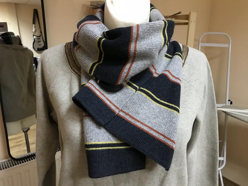 Теплый уютный серый шарф в полоску отлично подойдет к спортивной куртке или пальто.