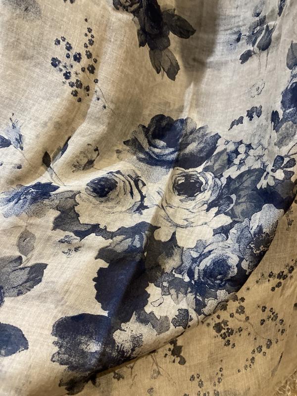 Надлегкий шарф з гарними акварельними блакитними трояндами. Склад—100%модал. модал - екологічно чистий штучний матеріал нового типу. Формально його можна назвати віскозою, оскільки сировиною для отримання волокон є букова, соснова або евкаліптова деревина, при його виробництві не вживають шкідливих інгредієнтів, а отримані волокна відрізняються тонкістю та м'якістю.