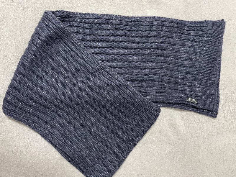 Тёплый вязанный шарф. Цвет синий с золотистой ниткой.