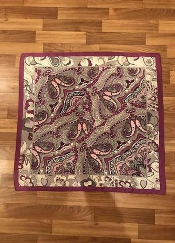 Стильный платок,состояние очень хорошее,следы носки минимальные,небольшой дефект на шве Есть бирка. Шов не роуль. Размер 68*72 Цвет ближе к фиолетовому. Состав: Шёлк Доставка: 🚌-доставка укрпочта и нп